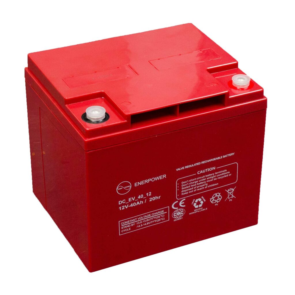 Batteria Deep Cycle Gel 12V 40Ah Enerpower DCEV 40-12. Batteria per veicoli elettrici, golf car, macchine lavapavimenti, piattaforme aeree, gruppi di continuità (UPS), luci di emergenza, antifurto, allarmi, fotovoltaico, servizi di bordo, camper e nautica.