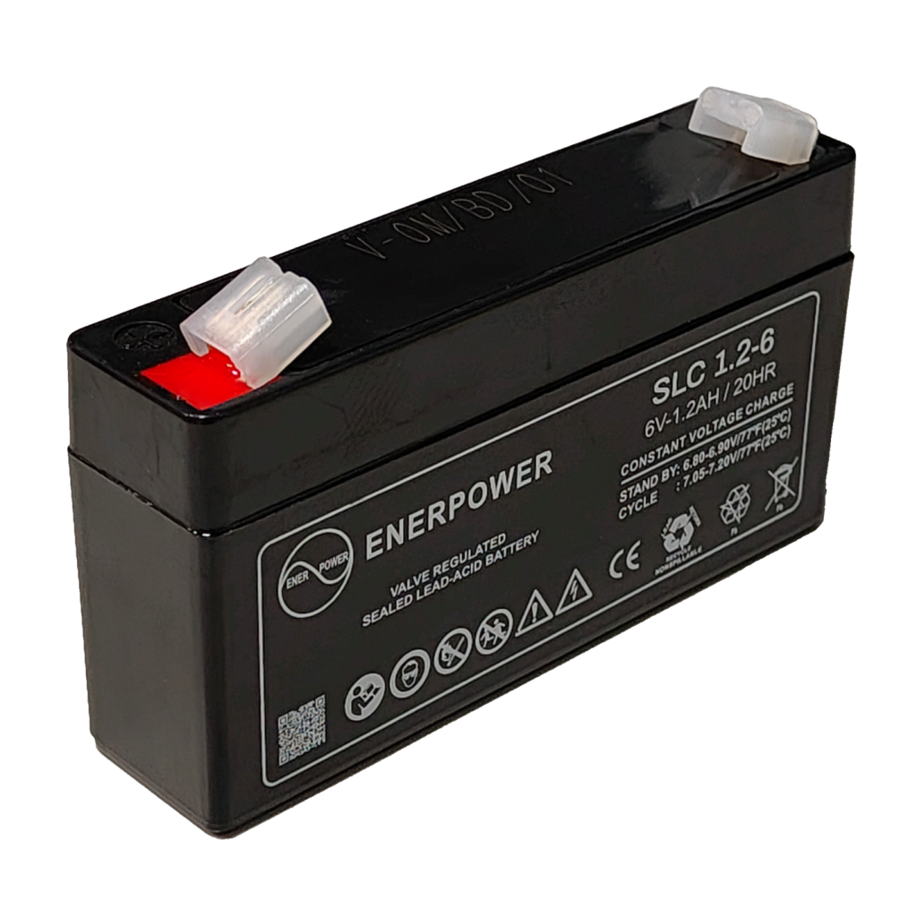 Batteria ermetica sigillata AGM VRLA 6V 1,2Ah Enerpower SLC 1,2-6 per gruppi di continuità (UPS), telecomunicazioni, luci di emergenza, antifurto, allarmi, fotovoltaico, servizi di bordo, camper e nautica.